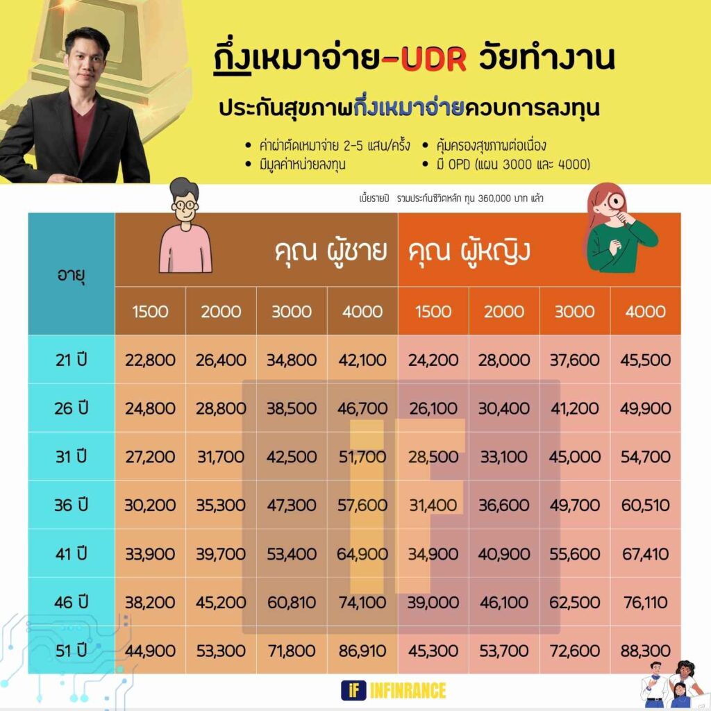 AIA Health Happy UDR ความคุ้มครองค่ารักษาพยาบาลเหมาจ่ายตามจริงที่เรียกเก็บจากโรงพยาบาล สูงสุดตามวงเงินต่อรอบปีกรมธรรม์ มีความคุ้มครอง OPD สำหรับแผน 25 ล้านบาท เหมาะสมสำหรับ Freelance เจ้าของธุระกิจ และพนักงานที่ต้องการเพิ่มสวัสดิการให้ตัวเอง
